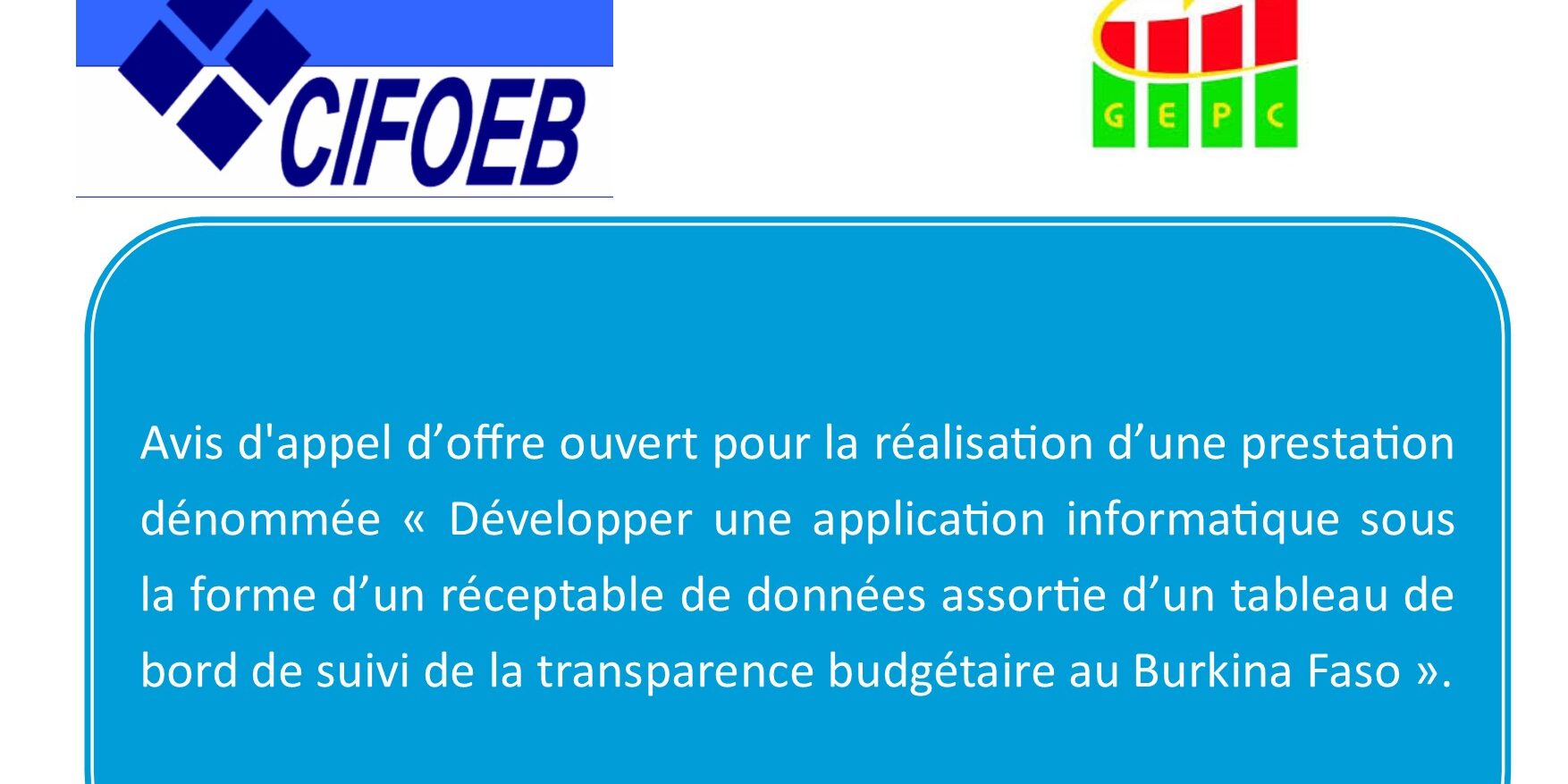 Le CIFOEB en partenariat avec le Projet de Gouvernance Economique et de Participation Citoyenne lance un avis d’appel d’offre ouvert pour la réalisation d’une prestation dénommée « Développer une application informatique sous la forme d’un réceptable de données assortie d’un tableau de bord de suivi de la transparence budgétaire au Burkina Faso ».